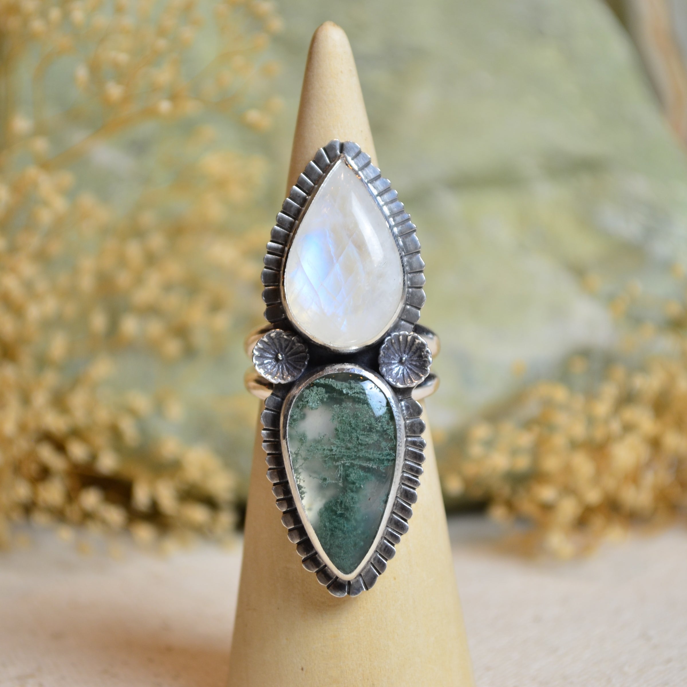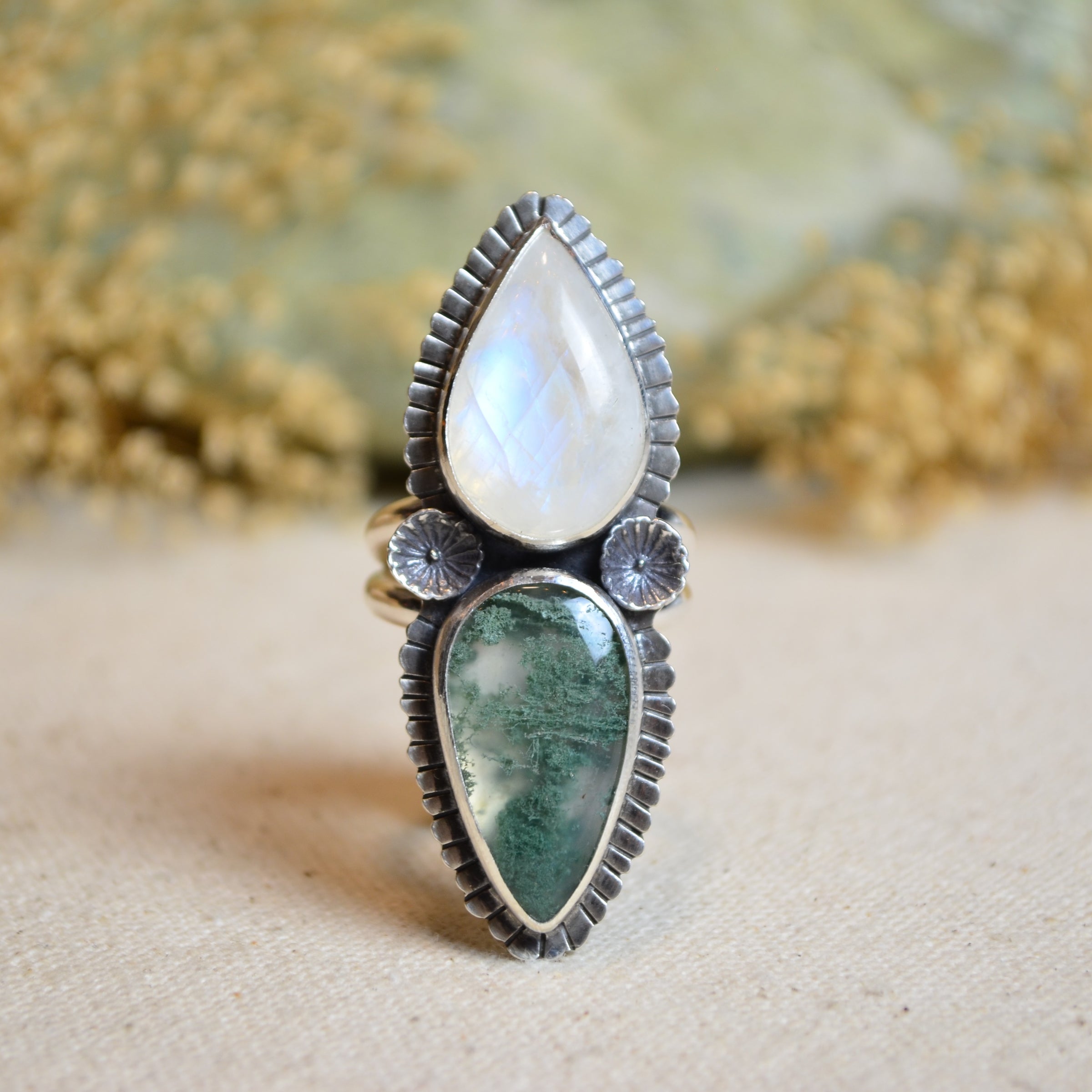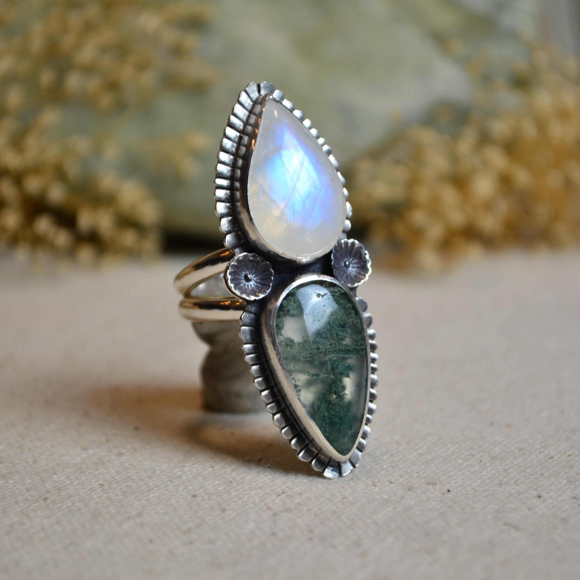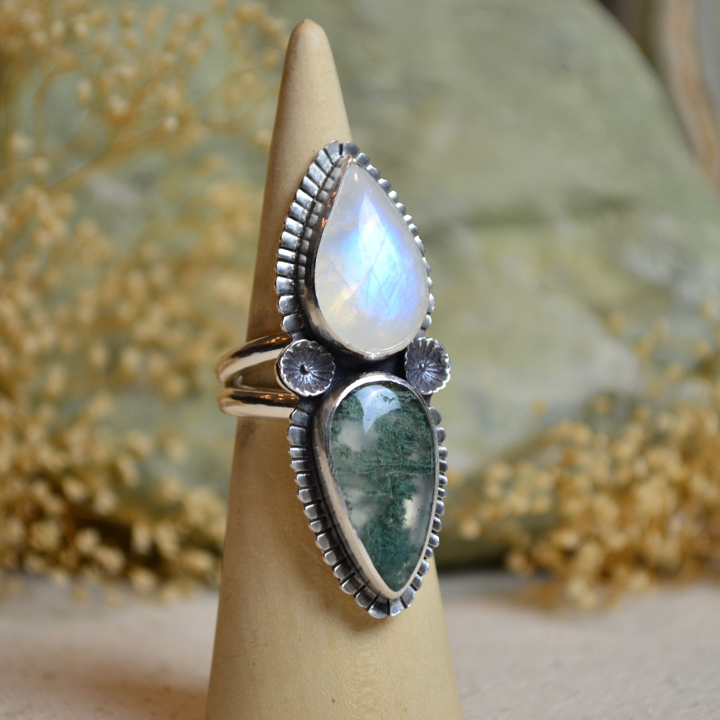 Rainbow Moonstone & Moss Agate Split Band Ring (Size 9)