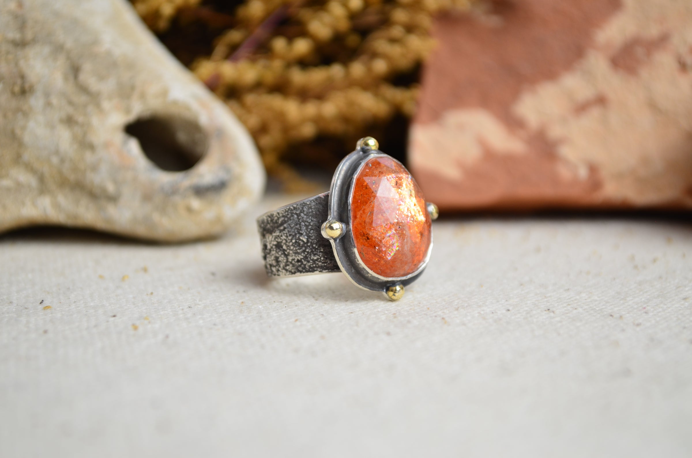 Sunstone Textured Wide Band Ring w/ 14K Accents (Size 8)